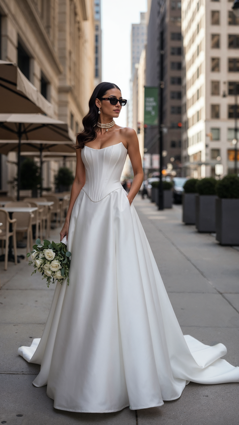 Detalhes: Corset com recortes verticais modeladores, saia ampla com bolsos embutidos, cauda escultural, estrutura limpa, sem bordados.